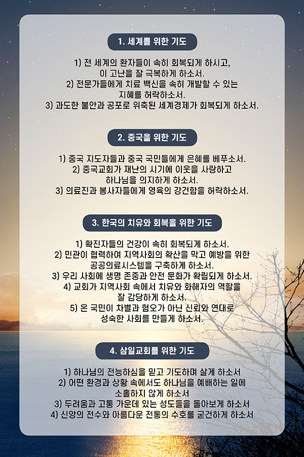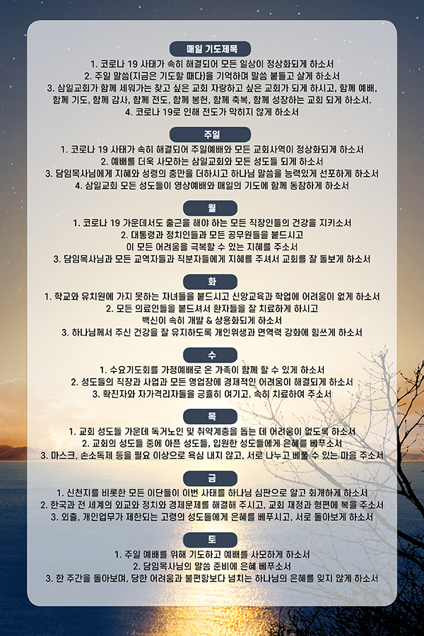 코로나 19 사태로 인해 함께 모여 예배를 할 수 없는 상황이 되었습니다. 현 상황과 교회와 나라를 위해서 기도해 주시고, 이럴 때일수록 신앙생활, 경건훈련이 흐트러지지 않고 예배를 사모하는 마음이 더욱 간절해지기를 소원합니다.